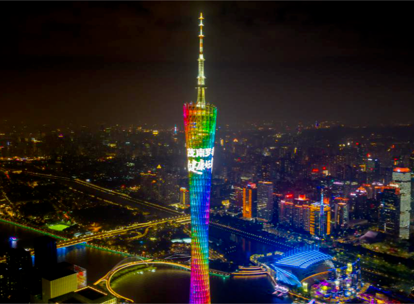 茂名罗非鱼品牌宣传海报亮相北京王府井大街核心商圈(左图);“茂南罗非鱼,健康好年鱼”的字样在广州塔塔身流转(右图)。